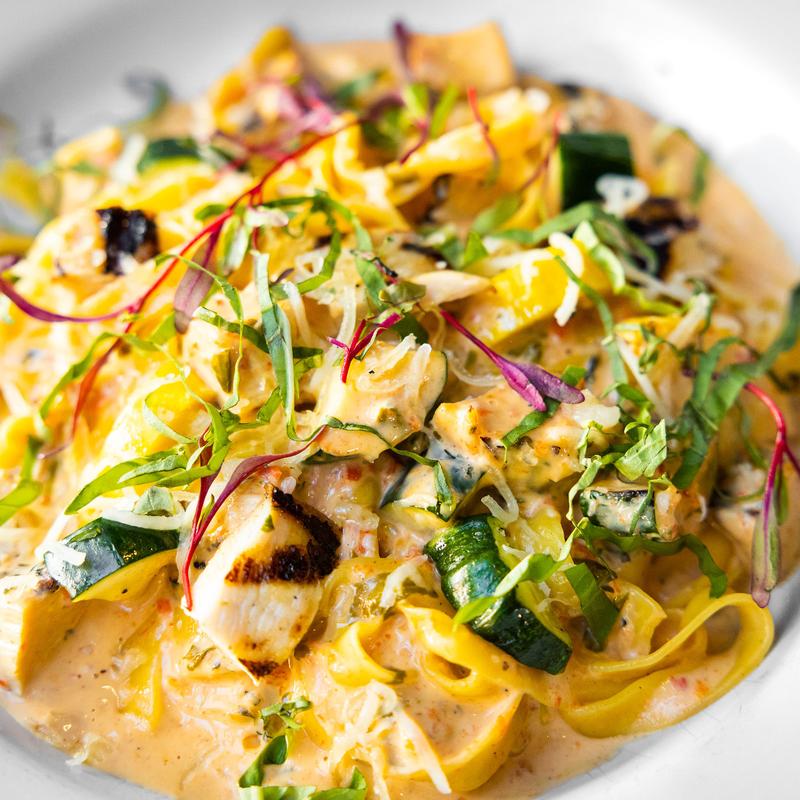 Red pepper cream sauce, grilled chicken, fresh fettuccini, seasonal vegetables, parmesan, basil